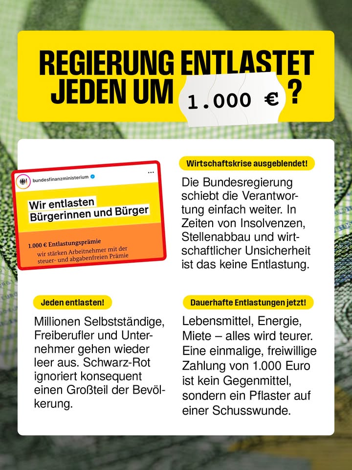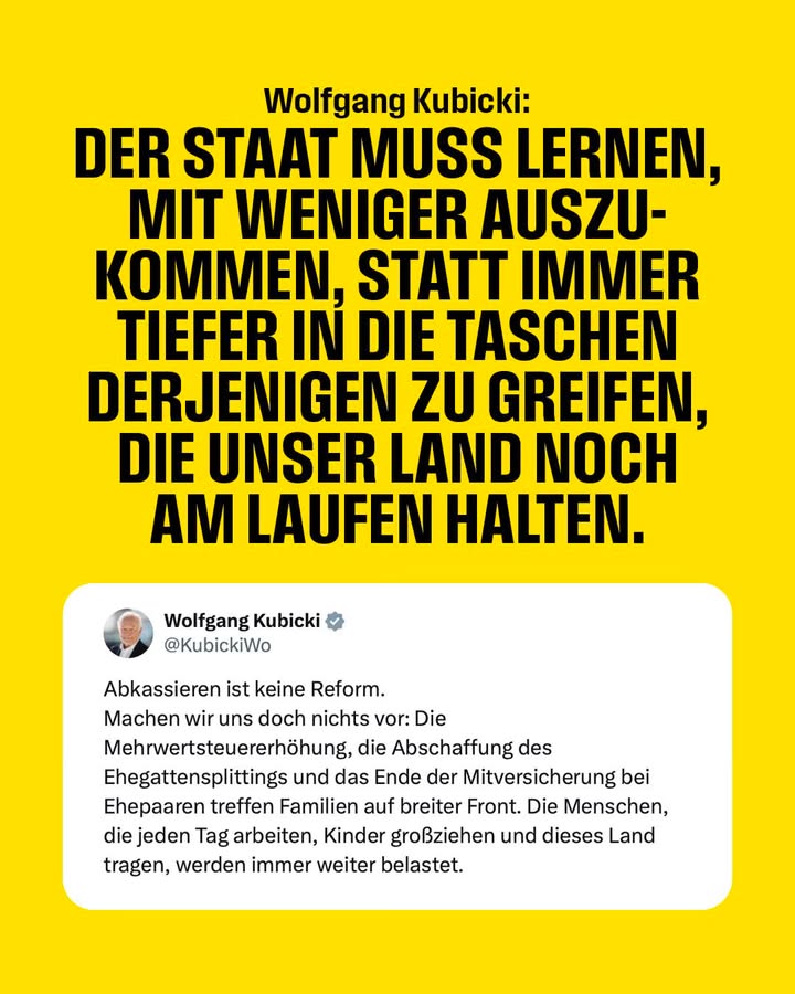 Wir senken Steuern, damit Leistung belohnt wird. Mit mehr Netto vom Brutto und einer gerechten Altersvorsorge ermöglichen wir Wohlstand für alle Generationen.